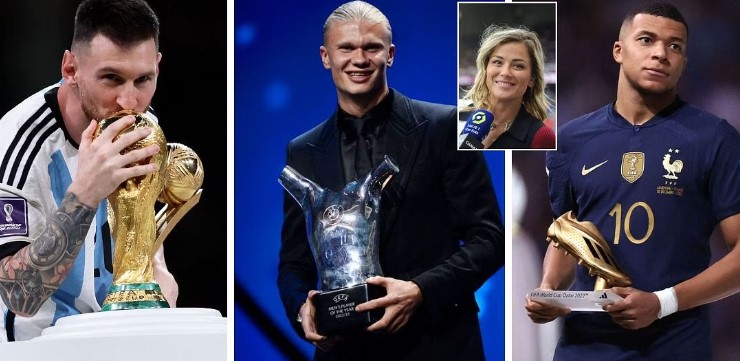 前法国和巴黎圣日尔曼女星劳尔·布洛 (Laure Boulleau) 在莱昂内尔·梅西 (Lionel Messi)、埃尔林·哈兰德 (Erling Haaland) 和基利安·姆巴佩 (Kylian Mbappe) 之间选择角逐 2023 年金球奖